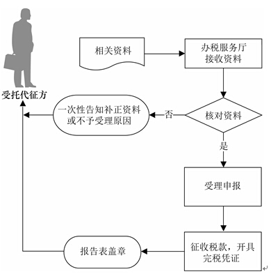 (1)办税服务厅接收申报人资料,核对申报人报送资料是否齐全、是否符合法定形式、填写内容是否完整、是否具有委托代征资格,符合的即时办结;不符合的当场一次性告知申报人应补正资料或不予受理原因。