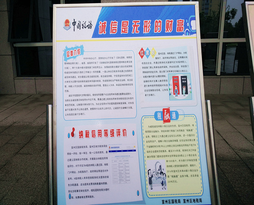 活动中,国地税两部门立足税法宣传工作,精心制作诚信宣传教育展板,以提高纳税信用级别评价制度的知晓度。此外,区局借助本次宣传周 “凝聚诚信力量,共建信用宣州”活动现场,向群众发放税法宣传单,悉心为纳税人答疑解惑,圆满完成诚信纳税宣传教育的任务。